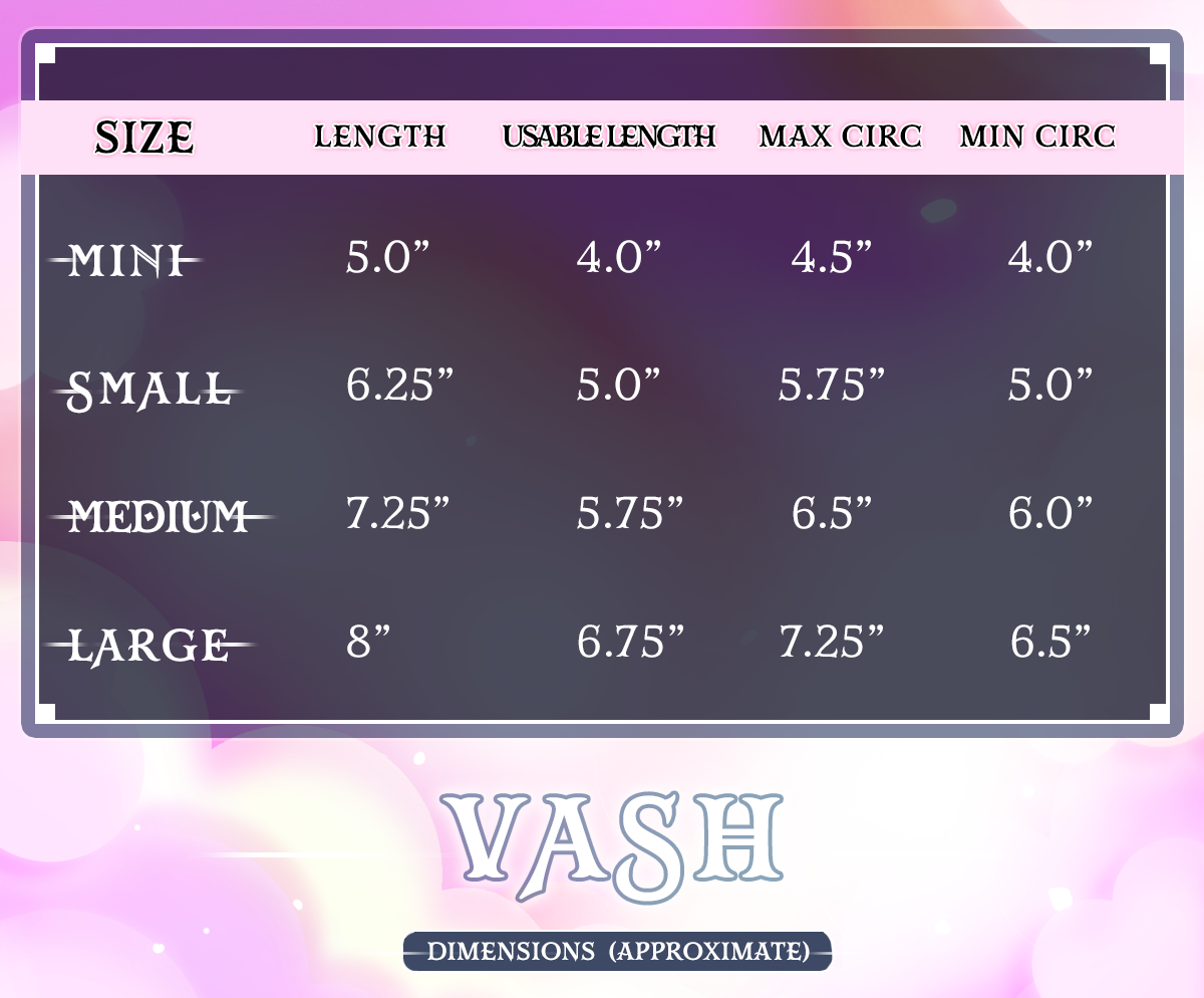Vash comes in mini, small, medium, & Large sizes.